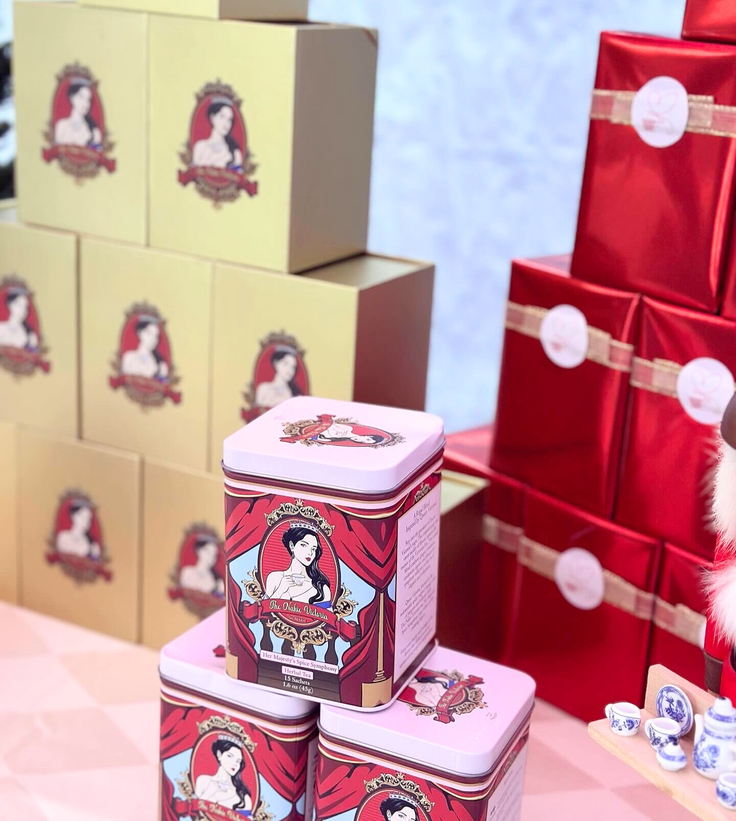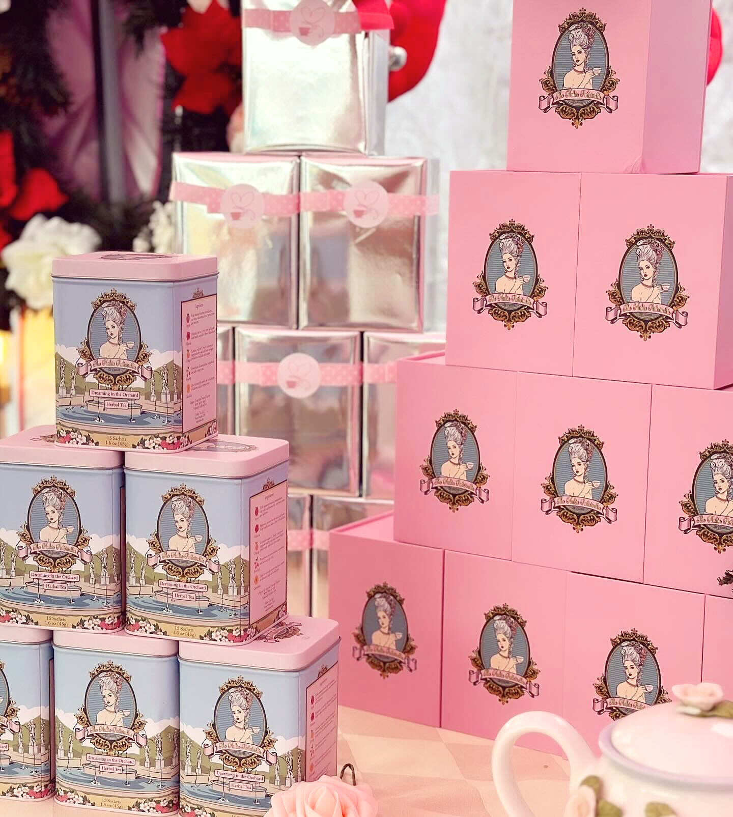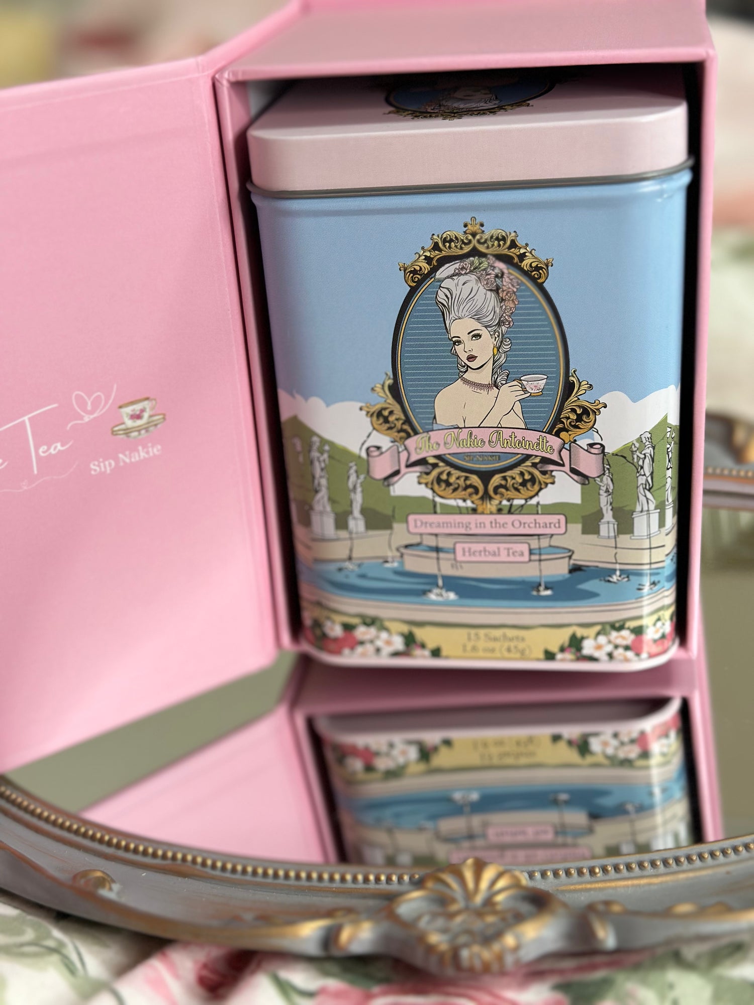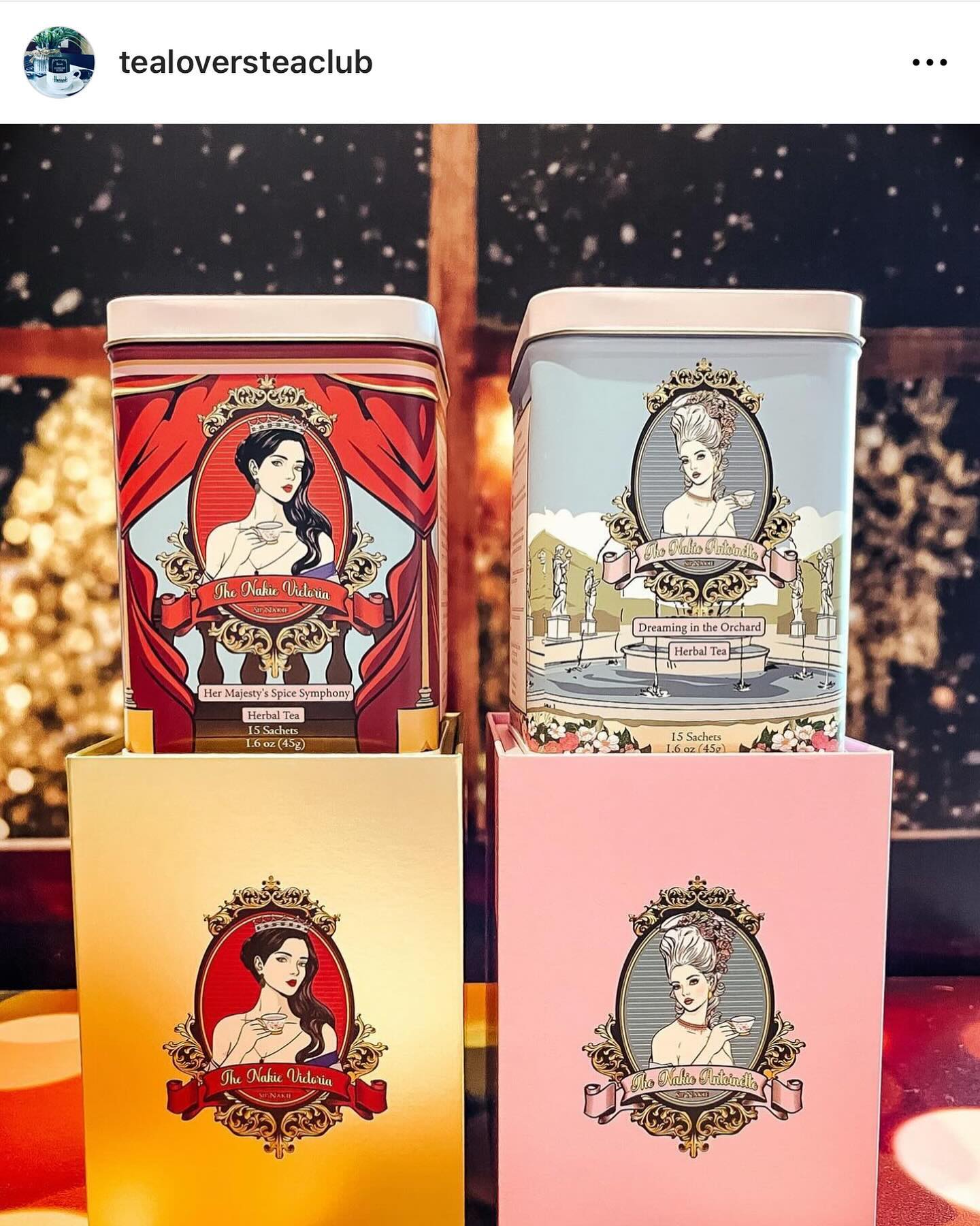 Nakie Tea tins and magnetic boxes brighten up any shelf with the hand drawn Nakie Antoinette and Nakie Victoria logos.